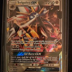 Säljer ett Pokémonkort av Solgaleo GX. Kortet har förmågan Ultra Road och attackerna Sunsteel Strike och Sol Burst GX.