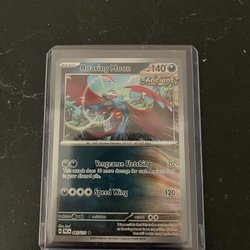 Säljer ett Pokémonkort av Roaring Moon. Kortet är av typen Basic och har 140 HP. Den har attackerna Vengeance Fletching och Speed Wing. Kortnummer 109/162.