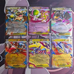 Pokémonkort med Mega Charizard X EX, Mega Sharpedo EX och Mismagius EX.