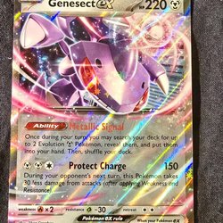 Säljer ett Pokémonkort av typen Genesect EX. Kortet har förmågan Metallic Signal och attacken Protect Charge.