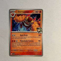 Säljer ett Pokémonkort av Darmanitan. Kortet är av typen Stage 1 och har 140 HP. Den har attackerna Searing Flame och Smashing Headbutt. Kortet har svaghet mot vatten och resistans.