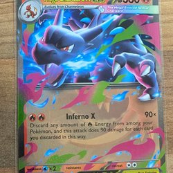 Pokémonkort säljes. Kortet är Mega Charizard EX, Phantasmal Flames. 013/094