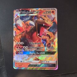 Pokémonkort av Charizard GX. Kortet har attackerna Raging Destruction och Steam Artillery. Det har också attacken Dreadful Flames GX.
