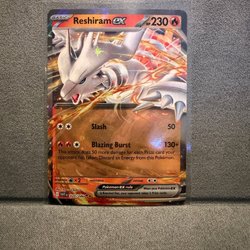 Ett Pokémonkort av Reshiram EX. Kortet är av typen Basic och har 230 HP. Den har attackerna Slash och Blazing Burst. Kortnummer 158/086.