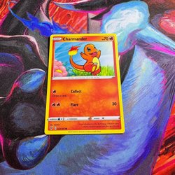 Sælger et Pokemon kort med Charmander. Kortet er i en beskyttende plastiklomme.