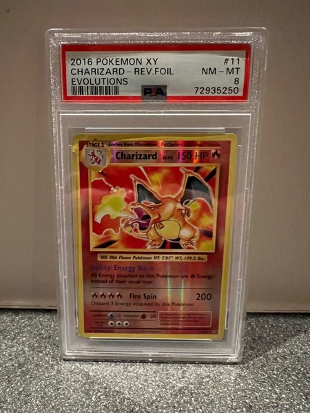 Dette er et 2016 Pokemon XY Evolutions Charizard Reverse Foil kort. Kortet er professionelt gradueret af PSA og har opnået en karakter på 8 (NM-MT). Kortet er nummer 11 i sættet.