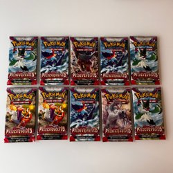 Ett oöppnat booster pack från Pokémon TCG-serien Scarlet & Violet—Paldea Evolved.