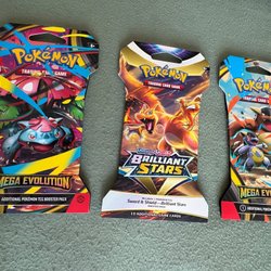 Fyra oöppnade boosterpaket från Pokémon Trading Card Game. Varje paket är av typen "Mega Evolution".
