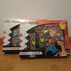 Pokémon TCG Celebrations Collection med Lance's Charizard V. Innehåller booster packs och ett foil promo kort med Lance's Charizard V. Perfekt för samlare och Pokémon-fans.