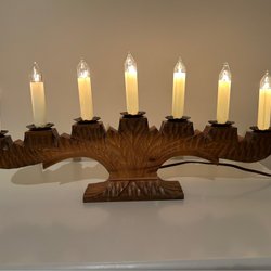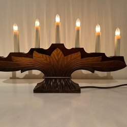 Röd adventsljusstake i trä från Konstsmide. Ljusstaken har sju lampor och är avsedd för inomhusbruk. Sladden är 1,7 meter lång. Max 7 x 3W 230-240V. Mått: 45 cm x 8 cm.I fint skick .