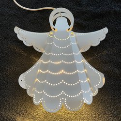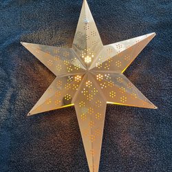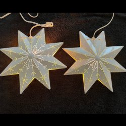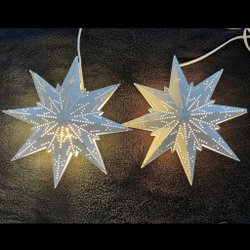 Par av adventsstjärnor i koppar. Hålmönster som sprider ett vackert sken. Vit sladd med smal ojordad kontakt .