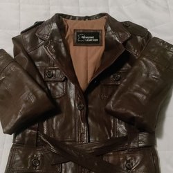 Brun jacka med detaljer som dragkedjor och bälte. Jackan har en krage i teddy material. Storlek S
