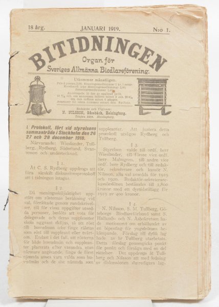 Organ för Sveriges Allmänna Biodlareförening. Utgiven i januari 1919. Artonde årgången. Saknar pärm. Nött.