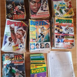Ett parti med Buster serietidningar från 1970-talet. Tidningarna har sporttema och innehåller serier och artiklar.