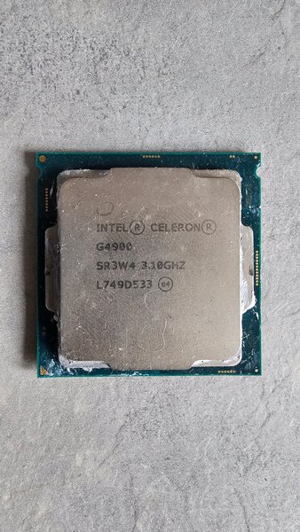 Intel Celeron G4900 processor med en klockfrekvens på 3.10GHz. Modellnummer SR3W4 och L749D533 (e4).