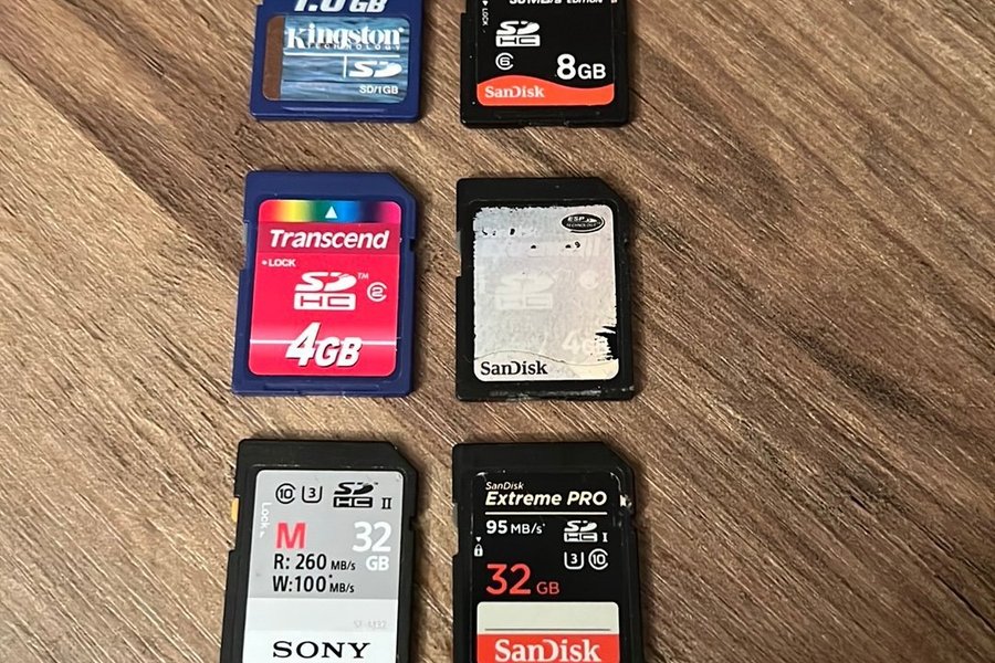 Ett blandat set med SD-kort. Inkluderar Kingston 1.0 GB, SanDisk Extreme III 8GB, Transcend 4GB, SanDisk Extreme PRO 32GB och Sony 32GB.