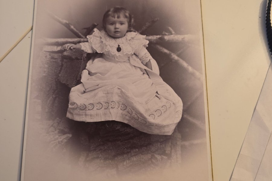 Ett fotografi föreställande ett barn i ljusa kläder. Fotot är i svartvitt och har en signatur från fotografen A. Wiklund, filialer Sävsjö & Hvetlanda.