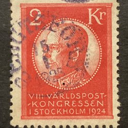 Facit 208 1924, skapligt stämplat Bovallstrand 28-1x-24, tyvärr rejäl riss uppe i vänstra hörnet vilket syns på bilderna, annars bra Facitvärde på detta märken.