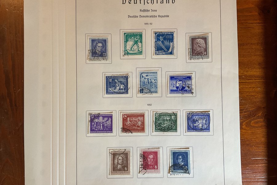 Ett albumblad urtaget ur ett album med stämplade frimärken från DDR 1952.