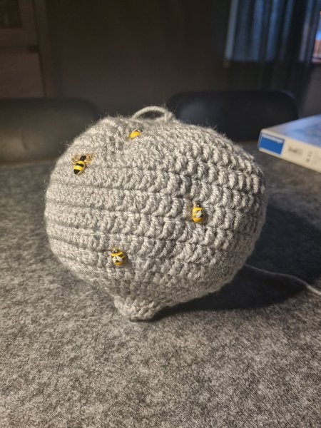 Virkad getingfälla som är stoppad med bubbelplast. Sätt upp den där du brukar ha besvär med getingbon så lurar du dom att boplatser är upptagen redan.