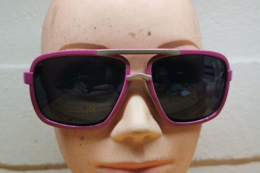 Ett par solglasögon med rosa ram och mörka glas. Unika glasögon