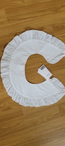 Vit krage med volangdetaljer. Kragen knäpps med en knapp mitt bak.