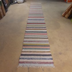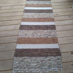 En handvävd trasmatta i varierande färger och mönster. Perfekt för att ge en personlig touch till ditt hem. Tumstocken är 180cm lång för referens