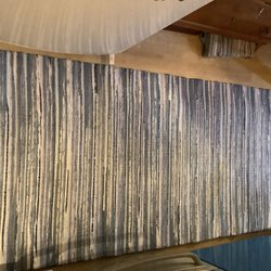 En dubbelvävd trasmatta med ett mönster av ränder i olika färger. Mattan har fransar på kortsidorna. Olika mönster på båda sidorna. Vintage 80 cm x 165 cm.