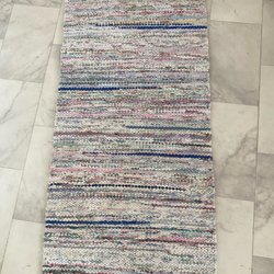 Trivsam randig trasmatta i ljusblått och krämvitt från Søstrene Grenes. 100 procent bomull. Mäter cirka 60x92 cm.