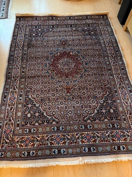 Matta, 190 x 140 cm, med detaljerat orientaliskt mönster. Mattan har en central medaljong och en bred bård runt kanterna. Färgerna inkluderar rött, blått och beige.