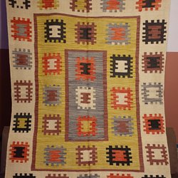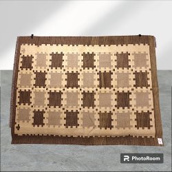 En handvävd matta med ett unikt geometriskt mönster. Mattans mått är 2,02 x 1,59 meter.
