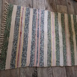 Trasmatta i bomull med fransar. Mattan har ett flerfärgat randigt mönster i nyanser av rosa, blått, grönt och vitt. Den är lämplig för användning i olika rum i hemmet.