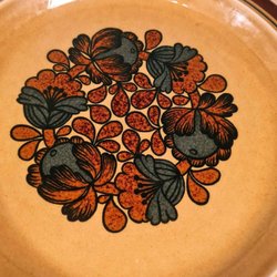 Mattan har ett detaljerat mönster i blått, beige och brunt. Den har fransar i båda ändar.