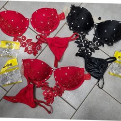 Grönt spetsunderklädesset med två behåar och två stringtrosor samt strumpeband. Behåarna har justerbara axelband. Setet har guldfärgade detaljer. ALDRIG ANvÄNDA, bara uppackade.