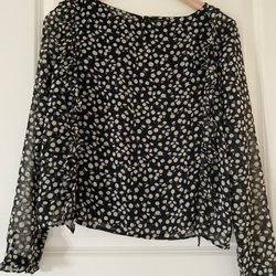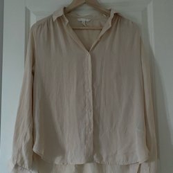 Långärmad blå topp med krage och knäppning framtill. figursydd passform och rynkig design.