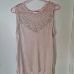 Rosa stickad topp med silverfärgade pärlor. Toppen har breda axelband och en ribbstickad nederkant.