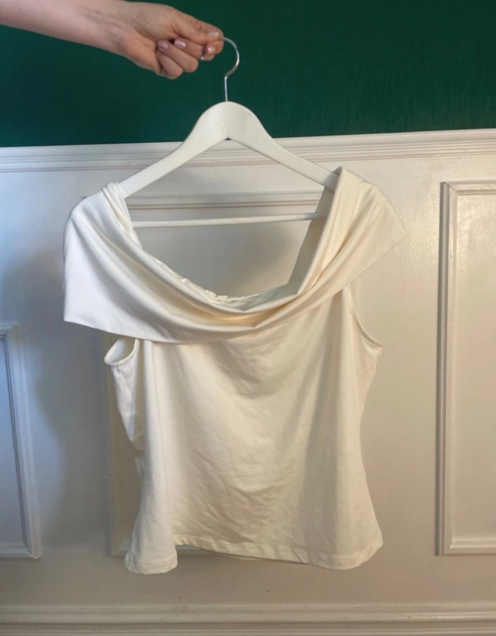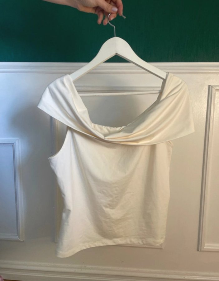 En figurnära topp i stretchig trikå. Toppen har bara axlar och bred, nedvikt kant upptill.