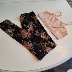 Två fina halterneck toppar. Den ena är vit med röda blommor och har ett rött band. Den andra är ljusgrön med blommigt mönster och smala axelband.