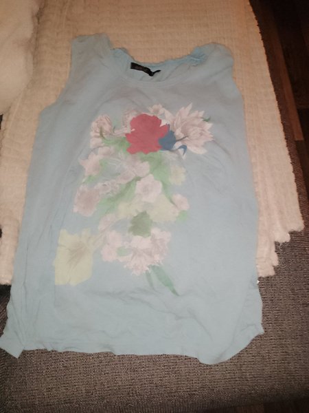Ljusblå ärmlös topp med ett blommigt tryck i olika färger som rött, vitt och grönt.