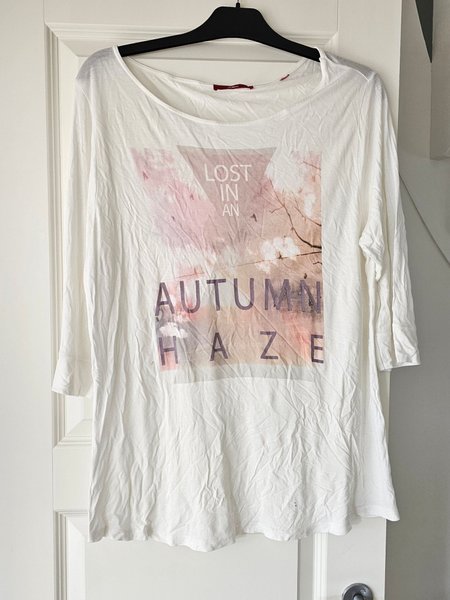 Vit topp med tryck av ett landskap med texten "Lost in an Autumn Haze". Strl L