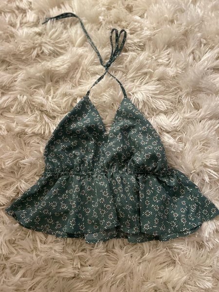 Grön halterneck topp med ett blommigt mönster och smala band som knyts i nacken. Toppen har en smockad resår under bysten som ger en fin passform och en volang nedtill.