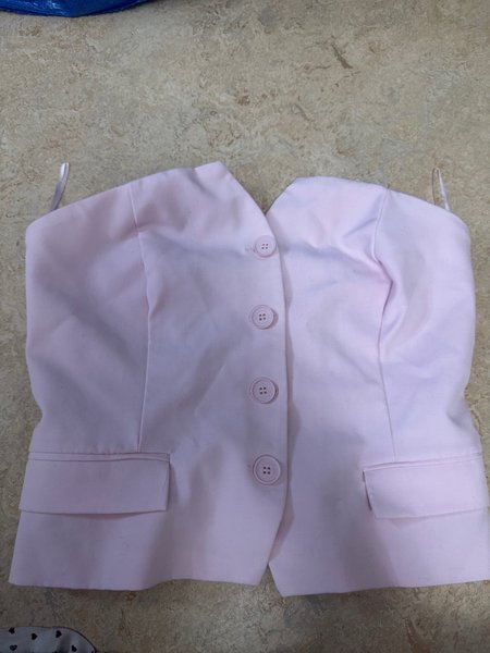 Kort topp i en ljusrosa nyans med knappar framtill. Toppen är ärmlös och har en rak skärning upptill. Den har två fickimitationer framtill.