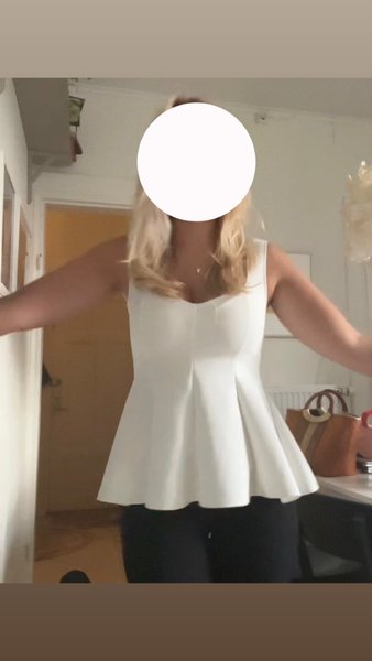 Vit peplumtopp med en smickrande passform som framhäver midjan. Toppen har en hjärtformad urringning och är ärmlös, vilket gör den perfekt för varmare väder eller att bära under en kavaj. Den utsvängda nederdelen ger en elegant silhuett. Från Zara, sparsamt använd.