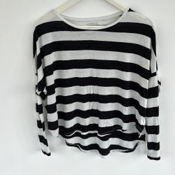 Svart och vit randig långärmad tröja med en liten broderad logotyp på bröstet. Rund halsringning.