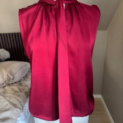 Röd, ärmlös topp med volangdetaljer runt halsringningen. Strl L. Använd endast ett par gånger.