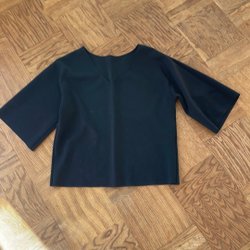 Sort top med pufærmer og firkantet halsudskæring. Toppen har en åben ryg med bindebånd og knapper foran.
