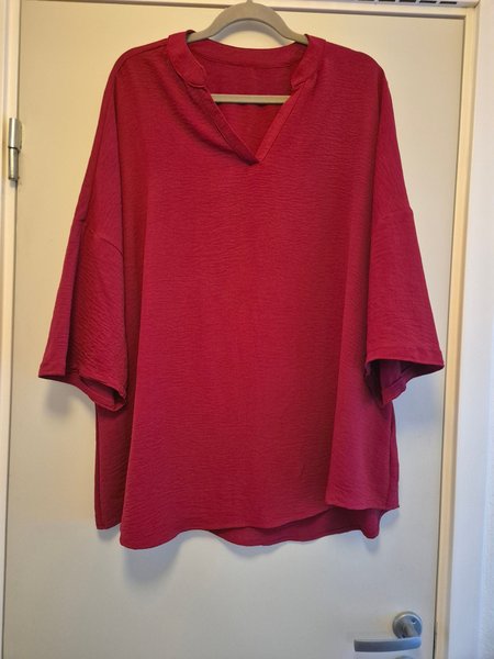 Röd topp med v-ringning och trekvartsärmar. Toppen har en avslappnad passform och en texturerad yta.