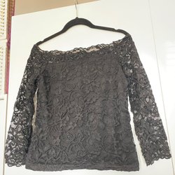 Svart topp med kort ärm. Toppen har ett spetsöverlager upptill och en slät, genomskinlig nederdel som är längre baktill.