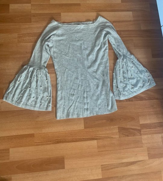 Grå tröja med lång ärm och vida ärmslut dekorerade med pärlor. Fint skick i Stl M
