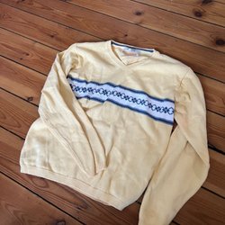 Gul stickad tröja med hög krage och ett diamantformat mönster framtill. Tröjan har långa ärmar och en ribbad nederkant.